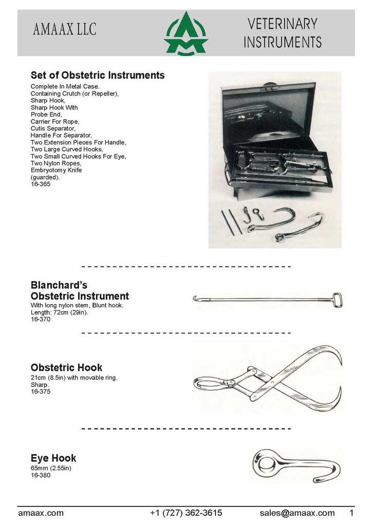 Set of Obstetric Instruments Complete In Metal Case. Containing Crutch (or Repeller), Sharp Hook, Sharp Hook With Probe End, Carrier For Rope, Cutis Separator, Handle For Separator, Two Extension Pieces For Handle, Two Large Curved Hooks, Two Small Curved Hooks For Eye, Two Nylon Ropes, Embryotomy Knife (guarded). 16-365 Blanchard?s Obstetric Instrument With long nylon stem, Blunt hook. Length: 72cm (29in). 16-370 Obstetric Hook 21cm (8.5in) with movable ring. Sharp. 16-375 Eye Hook 65mm (2.55in) 16-380