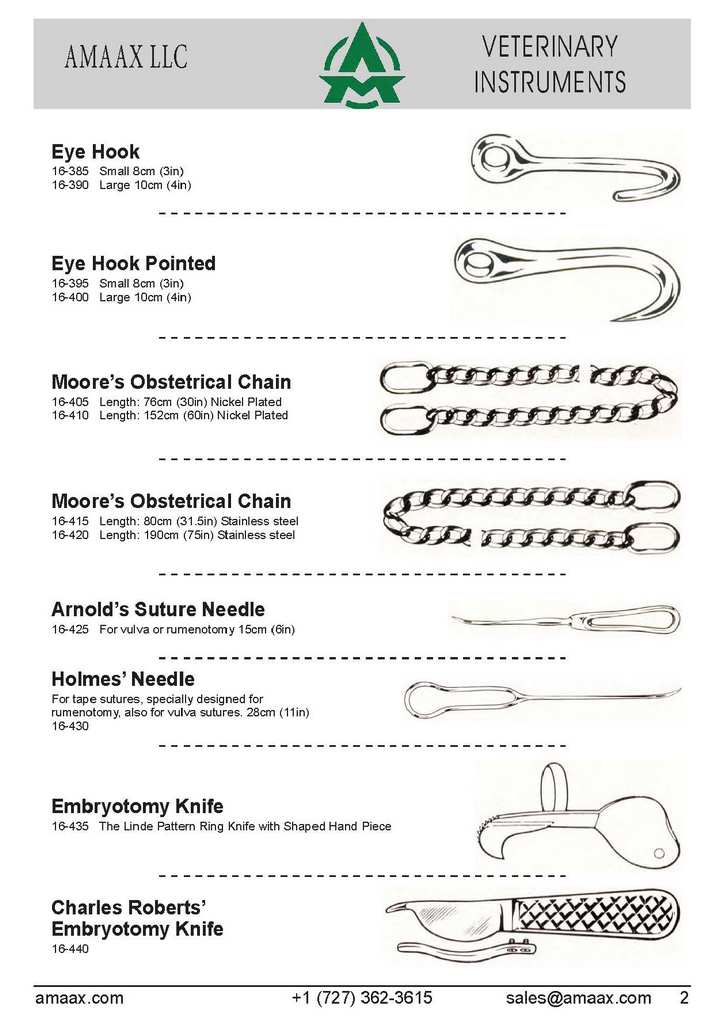 Eye Hook 16-385 Small 8cm (3in) 16-390 Large 10cm (4in) Eye Hook Pointed 16-395 Small 8cm (3in) 16-400 Large 10cm (4in) Moore?s Obstetrical Chain 16-405 Length: 76cm (30in) Nickel Plated 16-410 Length: 152cm (60in) Nickel Plated Moore?s Obstetrical Chain 16-415 Length: 80cm (31.5in) Stainless steel 16-420 Length: 190cm (75in) Stainless steel Arnold?s Suture Needle 16-425 For vulva or rumenotomy 15cm (6in) Holmes? Needle For tape sutures, specially designed for rumenotomy, also for vulva sutures. 28cm (11in) 16-430 Embryotomy Knife 16-435 The Linde Pattern Ring Knife with Shaped Hand Piece Charles Roberts? Embryotomy Knife 16-440