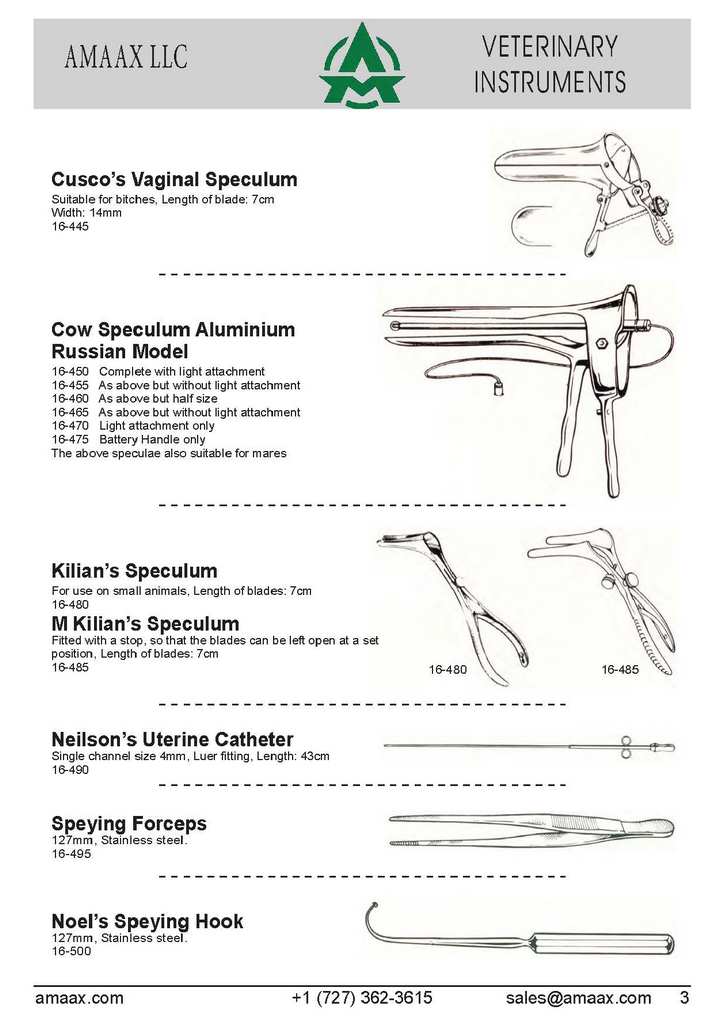 Cusco?s Vaginal Speculum Suitable for bitches, Length of blade: 7cm Width: 14mm 16-445 Cow Speculum Aluminium Russian Model 16-450 Complete with light attachment 16-455 As above but without light attachment 16-460 As above but half size 16-465 As above but without light attachment 16-470 Light attachment only 16-475 Battery Handle only The above speculae also suitable for mares Kilian?s Speculum For use on small animals, Length of blades: 7cm 16-480 M Kilian?s Speculum Fitted with a stop, so that the blades can be left open at a set position, Length of blades: 7cm 16-485 Neilson?s Uterine Catheter Single channel size 4mm, Luer fitting, Length: 43cm 16-490 Speying Forceps 127mm, Stainless steel. 16-495 Noel?s Speying Hook 127mm, Stainless steel. 16-500