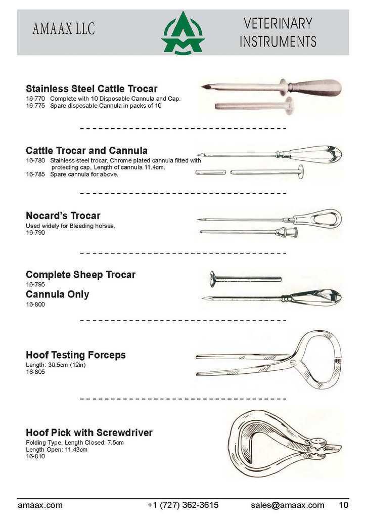 Stainless Steel Cattle Trocar 16-770 Complete with 10 Disposable Cannula and Cap. 16-775 Spare disposable Cannula in packs of 10 Cattle Trocar and Cannula 16-780 Stainless steel trocar, Chrome plated cannula fitted with protecting cap, Length of cannula 11.4cm. 16-785 Spare cannula for above. Nocard?s Trocar Used widely for Bleeding horses. 16-790 Complete Sheep Trocar 16-795 Cannula Only 16-800 Hoof Testing Forceps Length: 30.5cm (12in) 16-805 Hoof Pick with Screwdriver Folding Type, Length Closed: 7.5cm Length Open: 11.43cm 16-810