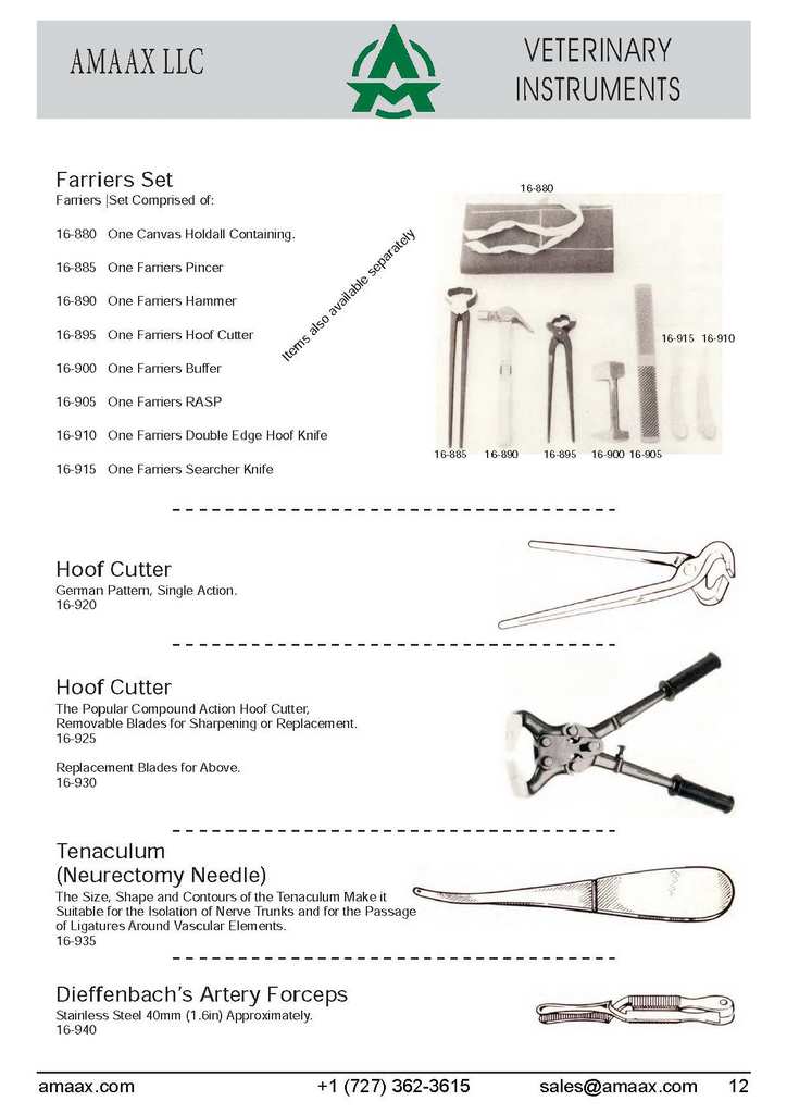 Farriers Set 16-880 Farriers |Set Comprised of: 16-880 One Canvas Holdall Containing. 16-885 One Farriers Pincer 16-890 One Farriers Hammer 16-895 One Farriers Hoof Cutter 16-900 One Farriers Buffer 16-905 One Farriers RASP 16-910 One Farriers Double Edge Hoof Knife 16-915 One Farriers Searcher Knife Hoof Cutter German Pattern, Single Action. 16-920 Hoof Cutter The Popular Compound Action Hoof Cutter, Removable Blades for Sharpening or Replacement. 16-925 Replacement Blades for Above. 16-930 Tenaculum (Neurectomy Needle) The Size, Shape and Contours of the Tenaculum Make it Suitable for the Isolation of Nerve Trunks and for the Passage of Ligatures Around Vascular Elements. 16-935 Dieffenbach?s Artery Forceps Stainless Steel 40mm (1.6in) Approximately. 16-940