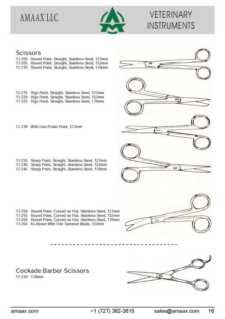 Scissors 17-200 Round Point, Straight, Stainless Steel, 127mm 17-205 Round Point, Straight, Stainless Steel, 152mm 17-210 Round Point, Straight, Stainless Steel, 178mm 17-215 Vigo Point, Straight, Stainless Steel, 127mm 17-220 Vigo Point, Straight, Stainless Steel, 152mm 17-225 Vigo Point, Straight, Stainless Steel, 178mm 17-230 With One Probe Point, 127mm 17-235 Sharp Point, Straight, Stainless Steel, 127mm 17-240 Sharp Point, Straight, Stainless Steel, 152mm 17-245 Sharp Point, Straight, Stainless Steel, 178mm 17-250 Round Point, Curved on Flat, Stainless Steel, 127mm 17-255 Round Point, Curved on Flat, Stainless Steel, 152mm 17-260 Round Point, Curved on Flat, Stainless Steel, 178mm 17-265 As Above With One Serrated Blade, 152mm Cockade Barber Scissors 17-270 178mm