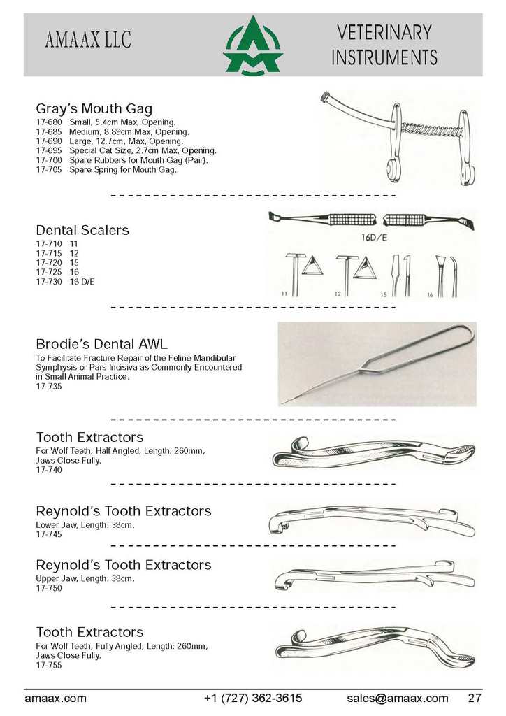Gray?s Mouth Gag 17-680 Small, 5.4cm Max, Opening. 17-685 Medium, 8.89cm Max, Opening. 17-690 Large, 12.7cm, Max, Opening. 17-695 Special Cat Size, 2.7cm Max, Opening. 17-700 Spare Rubbers for Mouth Gag (Pair). 17-705 Spare Spring for Mouth Gag. Dental Scalers 17-710 11 17-715 12 17-720 15 17-725 16 17-730 16 D/E Brodie?s Dental AWL To Facilitate Fracture Repair of the Feline Mandibular Symphysis or Pars Incisiva as Commonly Encountered in Small Animal Practice. 17-735 Tooth Extractors For Wolf Teeth, Half Angled, Length: 260mm, Jaws Close Fully. 17-740 Reynold?s Tooth Extractors Lower Jaw, Length: 38cm. 17-745 Reynold?s Tooth Extractors Upper Jaw, Length: 38cm. 17-750 Tooth Extractors For Wolf Teeth, Fully Angled, Length: 260mm, Jaws Close Fully. 17-755