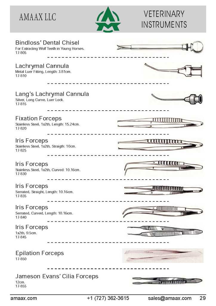 Bindloss? Dental Chisel For Extracting Wolf Teeth in Young Horses. 17-805 Lachrymal Cannula Metal Luer Fitting, Length: 3.81cm. 17-810 Lang?s Lachrymal Cannula Silver, Long Curve, Luer Lock. 17-815 Fixation Forceps Stainless Steel, 1x2th, Length: 15.24cm. 17-820 Iris Forceps Stainless Steel, 1x2th, Straigth: 10cm. 17-825 Iris Forceps Stainless Steel, 1x2th, Curved: 10.16cm. 17-830 Iris Forceps Serrated, Straight, Length: 10.16cm. 17-835 Iris Forceps Serrated, Curved, Length: 10.16cm. 17-840 Iris Forceps 1x2th, 9.5cm. 17-845 Epilation Forceps 17-850 Jameson Evans? Cilia Forceps 12cm. 17-855