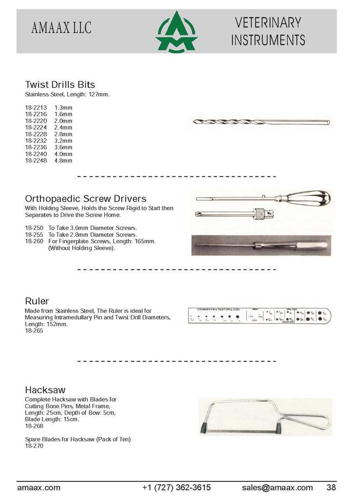 Twist Drills Bits Stainless Steel, Length: 127mm. 18-2213 1.3mm 18-2216 1.6mm 18-2220 2.0mm 18-2224 2.4mm 18-2228 2.8mm 18-2232 3.2mm 18-2236 3.6mm 18-2240 4.0mm 18-2248 4.8mm Orthopaedic Screw Drivers With Holding Sleeve, Holds the Screw Rigid to Start then Separates to Drive the Screw Home. 18-250 To Take 3.6mm Diameter Screws. 18-255 To Take 2.8mm Diameter Screws. 18-260 For Fingerplate Screws, Length: 165mm. (Without Holding Sleeve). Ruler Made from Stainless Steel, The Ruler is ideal for Measuring Intramedullary Pin and Twist Drill Diameters, Length: 152mm. 18-265 Hacksaw Complete Hacksaw with Blades for Cutting Bone Pins, Metal Frame, Length: 25cm, Depth of Bow: 5cm, Blade Length: 15cm. 18-268 Spare Blades for Hacksaw (Pack of Ten) 18-270