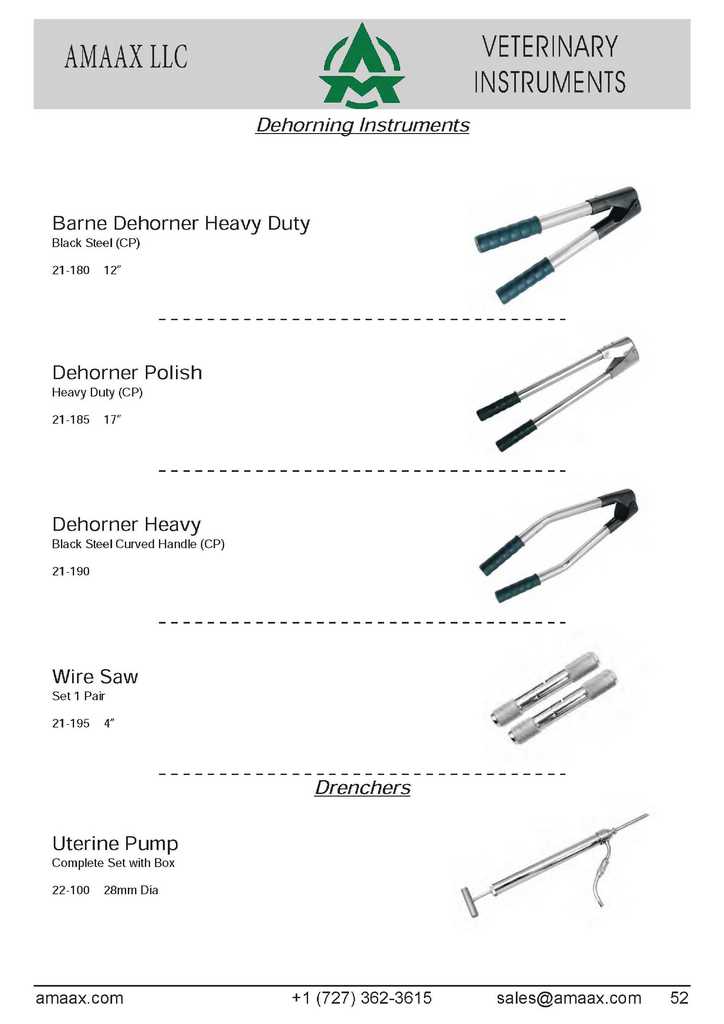 Dehorning Instruments Barne Dehorner Heavy Duty Black Steel (CP) 21-180 12? Dehorner Polish Heavy Duty (CP) 21-185 17? Dehorner Heavy Black Steel Curved Handle (CP) 21-190 Wire Saw Set 1 Pair 21-195 4? Drenchers Uterine Pump Complete Set with Box 22-100 28mm Dia