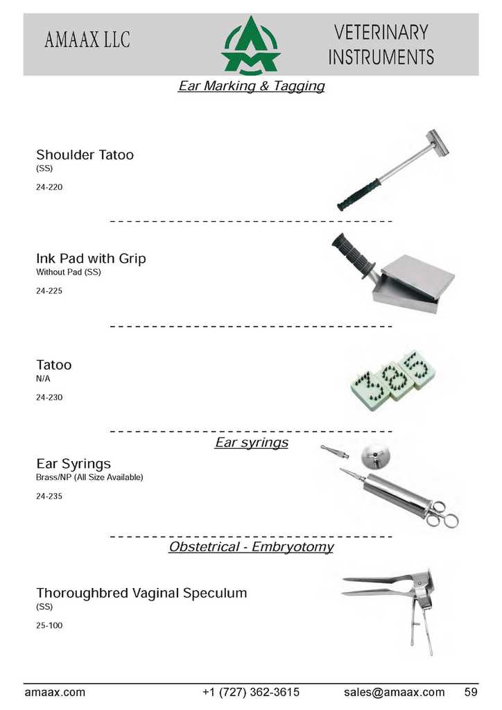 Ear Marking & Tagging Shoulder Tatoo (SS) 24-220 Ink Pad with Grip Without Pad (SS) 24-225 Tatoo N/A 24-230 Ear syrings Ear Syrings Brass/NP (All Size Available) 24-235 Obstetrical -Embryotomy Thoroughbred Vaginal Speculum (SS) 25-100