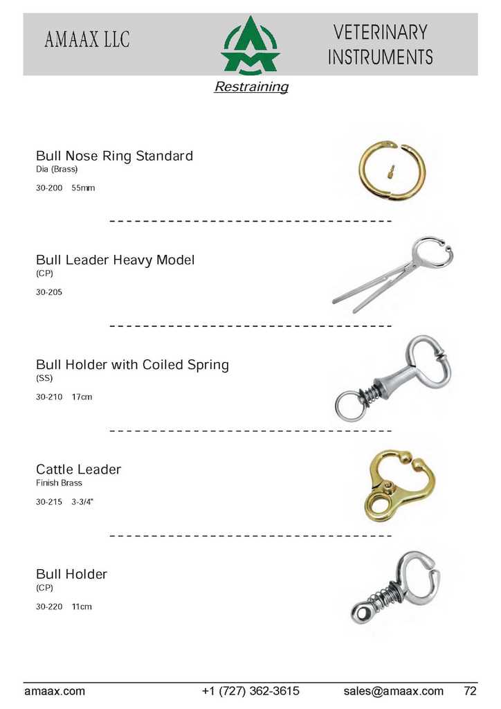 Restraining Bull Nose Ring Standard Dia (Brass) 30-200 55mm Bull Leader Heavy Model (CP) 30-205 Bull Holder with Coiled Spring (SS) 30-210 17cm Cattle Leader Finish Brass 30-215 3-3/4″ Bull Holder (CP) 30-220 11cm