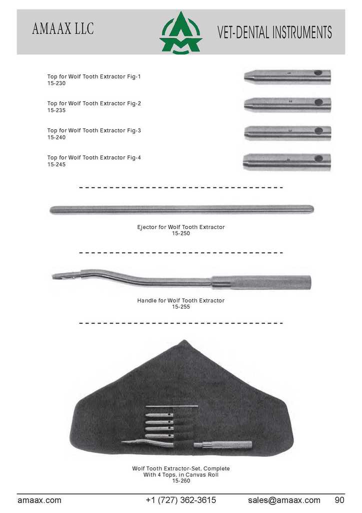Top for Wolf Tooth Extractor Fig-1 15-230 Top for Wolf Tooth Extractor Fig-2 15-235 Top for Wolf Tooth Extractor Fig-3 15-240 Top for Wolf Tooth Extractor Fig-4 15-245 Ejector for Wolf Tooth Extractor 15-250 Handle for Wolf Tooth Extractor 15-255 Wolf Tooth Extractor-Set, Complete With 4 Tops, in Canvas Roll 15-260