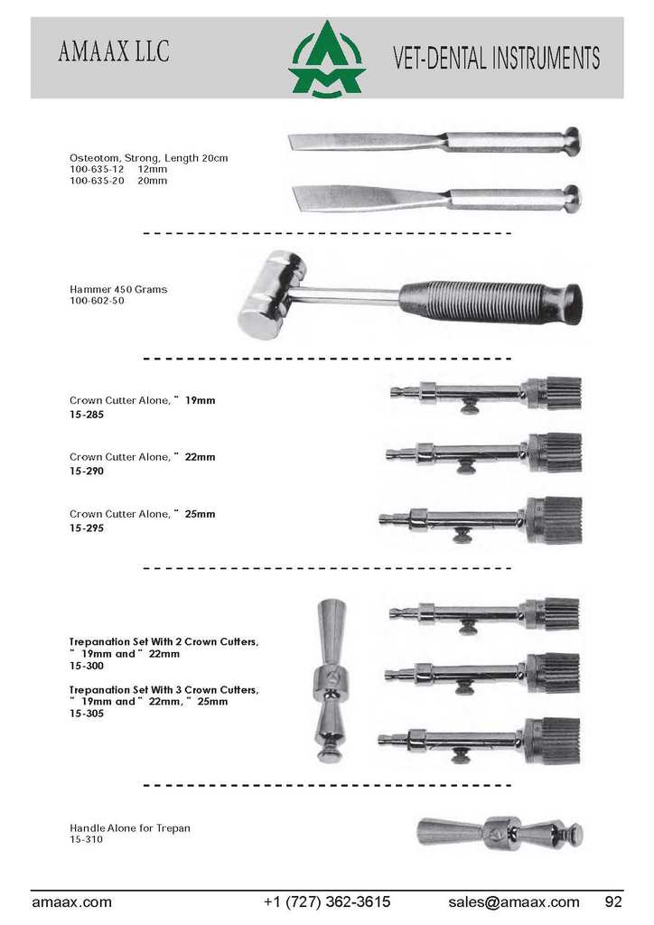 Osteotom, Strong, Length 20cm 100-635-12 12mm 100-635-20 20mm Crown Cutter Alone, ? 19mm 15-285 Crown Cutter Alone, ? 22mm 15-290 Crown Cutter Alone, ? 25mm 15-295 Trepanation Set With 2 Crown Cutters, ? 19mm and ? 22mm 15-300 Trepanation Set With 3 Crown Cutters, ? 19mm and ? 22mm, ? 25mm 15-305 Handle Alone for Trepan 15-310