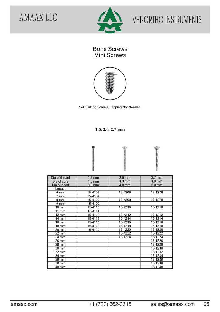 Bone Screws Mini Screws Self Cutting Screws, Tapping Not Needed. 1.5, 2.0, 2.7 mm Dia of thread 1.5 mm 2.0 mm 2.7 mm Dia of core 1.0 mm 1.3 mm 1.9 mm Dia of head 3.0 mm 4.0 mm 5.0 mm Length 6 mm 15-4106 15-4206 15-4276 7 mm 15-4107 8 mm 15-4108 15-4208 15-4278 9 mm 15-4109 10 mm 15-4110 15-4210 15-4210 11 mm 15-4111 12 mm 15-4112 15-4212 15-4212 14 mm 15-4114 15-4214 15-4214 16 mm 15-4116 15-4216 15-4216 18 mm 15-4118 15-4218 15-4218 20 mm 15-4120 15-4220 15-4220 22 mm 15-4222 15-4222 24 mm 15-4224 15-4224 26 mm 15-4226 28 mm 15-4228 30 mm 15-4230 32 mm 15-4232 34 mm 15-4234 36 mm 15-4236 38 mm 15-4238 40 mm 15-4240