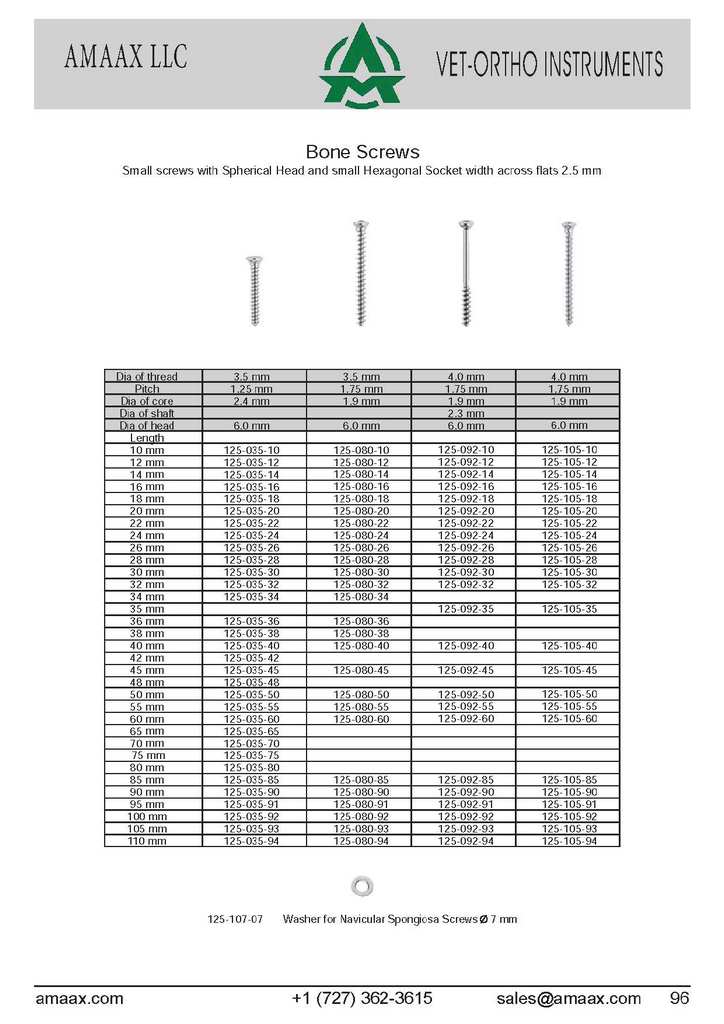 Bone Screws Small screws with Spherical Head and small Hexagonal Socket width across flats 2.5 mm Dia of thread 3.5 mm 3.5 mm 4.0 mm 4.0 mm Pitch 1.25 mm 1.75 mm 1.75 mm 1.75 mm Dia of core 2.4 mm 1.9 mm 1.9 mm 1.9 mm Dia of shaft 2.3 mm Dia of head 6.0 mm 6.0 mm 6.0 mm 6.0 mm Length 10 mm 125-035-10 125-080-10 125-092-10 125-105-10 12 mm 125-035-12 125-080-12 125-092-12 125-105-12 14 mm 125-035-14 125-080-14 125-092-14 125-105-14 16 mm 125-035-16 125-080-16 125-092-16 125-105-16 18 mm 125-035-18 125-080-18 125-092-18 125-105-18 20 mm 125-035-20 125-080-20 125-092-20 125-105-20 22 mm 125-035-22 125-080-22 125-092-22 125-105-22 24 mm 125-035-24 125-080-24 125-092-24 125-105-24 26 mm 125-035-26 125-080-26 125-092-26 125-105-26 28 mm 125-035-28 125-080-28 125-092-28 125-105-28 30 mm 125-035-30 125-080-30 125-092-30 125-105-30 32 mm 125-035-32 125-080-32 125-092-32 125-105-32 34 mm 125-035-34 125-080-34 35 mm 125-092-35 125-105-35 36 mm 125-035-36 125-080-36 38 mm 125-035-38 125-080-38 40 mm 125-035-40 125-080-40 125-092-40 125-105-40 42 mm 125-035-42 45 mm 125-035-45 125-080-45 125-092-45 125-105-45 48 mm 125-035-48 50 mm 125-035-50 125-080-50 125-092-50 125-105-50 55 mm 125-035-55 125-080-55 125-092-55 125-105-55 60 mm 125-035-60 125-080-60 125-092-60 125-105-60 65 mm 125-035-65 70 mm 125-035-70 75 mm 125-035-75 80 mm 125-035-80 85 mm 125-035-85 125-080-85 125-092-85 125-105-85 90 mm 125-035-90 125-080-90 125-092-90 125-105-90 95 mm 125-035-91 125-080-91 125-092-91 125-105-91 100 mm 125-035-92 125-080-92 125-092-92 125-105-92 105 mm 125-035-93 125-080-93 125-092-93 125-105-93 110 mm 125-035-94 125-080-94 125-092-94 125-105-94 125-107-07 Washer for Navicular Spongiosa Screws 7 mm