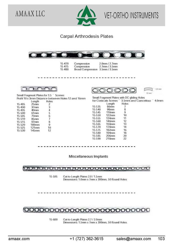 Carpal Arthrodesis Plates 15-470 Compression 2.0mm / 2.7mm 15-475 Compression 2.7mm / 3.5mm 15-480 Broad Compression 3.5mm / 3.5mm Small Fragment Plates for 3.5 ? Screws Small Fragment Plates with DC gliding Holes Profil 10 x 3mm Distance between Holes 12 and 16mm for Corticalis Screws ? 3.5mm and Cancellous ? 4.0mm Length Holes Length Holes 15-485 25mm 2 15-535 86mm 7 15-490 37mm 3 15-540 98mm 8 15-495 49mm 4 15-545 110mm 9 15-500 61mm 5 15-550 122mm 10 15-505 73mm 6 15-555 134mm 11 15-510 85mm 7 15-560 146mm 12 15-515 97mm 8 15-565 158mm 13 15-520 109mm 9 15-570 170mm 14 15-525 121mm 10 15-575 182mm 16 15-530 145mm 12 15-580 194mm 18 15-585 206mm 20 15-590 218mm 22 Miscellaneous Implants 15-595 Cut-to-Length Plates 2.0 / 1.5mm Dimensions: 1.0mm x 7mm x 300mm, 50 Round Holes 15-600 Cut-to-Length Plates 2.7 / 2.0mm Dimensions: 1.5mm x 7mm x 300mm, 50 Round Holes