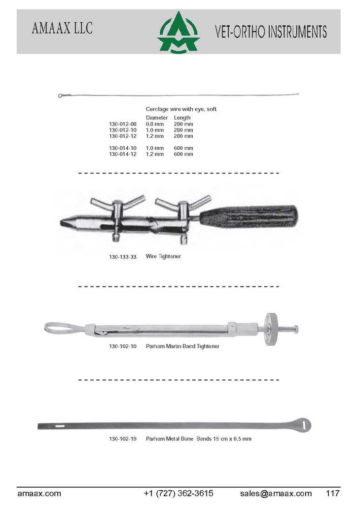 Cerclage wire with eye, soft Diameter Length 130-012-08 0.8 mm 280 mm 130-012-10 1.0 mm 280 mm 130-012-12 1.2 mm 280 mm 130-014-10 1.0 mm 600 mm 130-014-12 1.2 mm 600 mm 130-133-33 Wire Tightener 130-102-10 Parham Martin Band Tightener 130-102-19 Parham Metal Bone Bands 19 cm x 0.5 mm