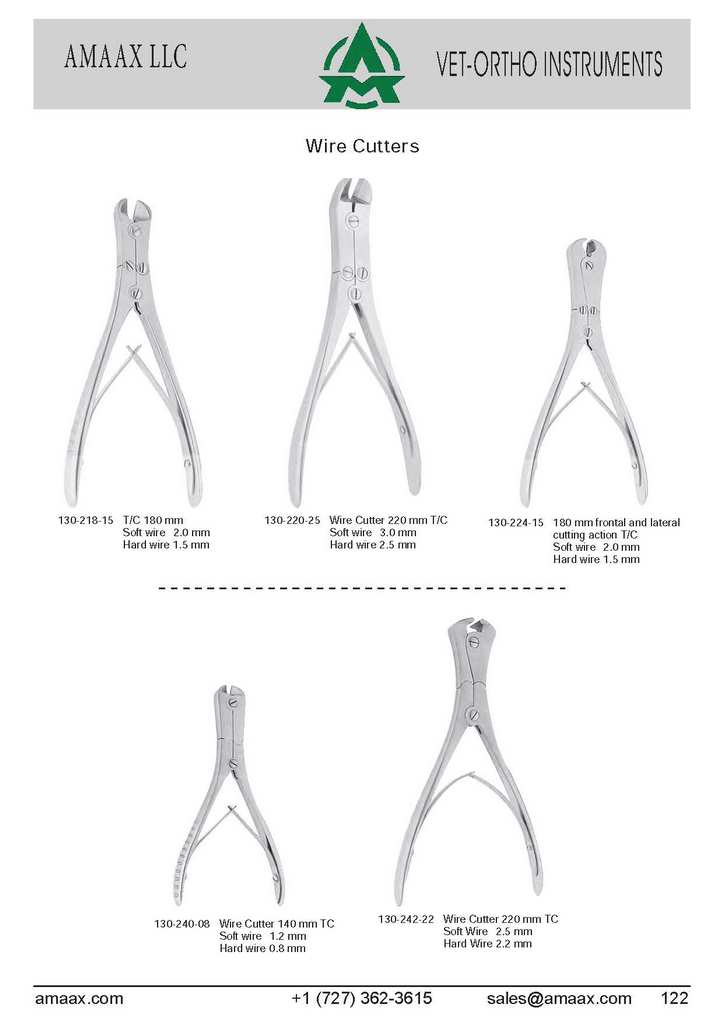 Wire Cutters 130-220-25 Wire Cutter 220 mm T/C 130-224-15 180 mm frontal and lateral Soft wire 3.0 mm cutting action T/C Hard wire 2.5 mm Soft wire 2.0 mm Hard wire 1.5 mm 130-240-08 Wire Cutter 140 mm TC 130-242-22 Wire Cutter 220 mm TC Soft wire 1.2 mm Soft Wire 2.5 mm Hard wire 0.8 mm Hard Wire 2.2 mm