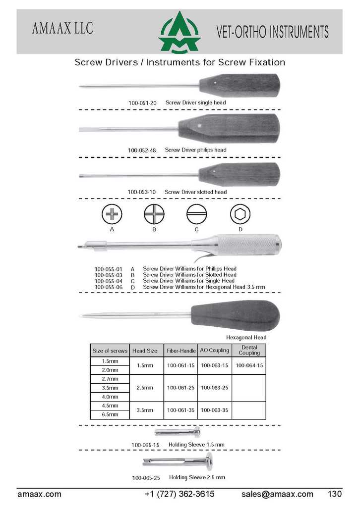 Screw Drivers / Instruments for Screw Fixation 100-051-20 Screw Driver single head 100-052-48 Screw Driver philips head 100-053-10 Screw Driver slotted head ABC D 100-055-01 A Screw Driver Williams for Phillips Head 100-055-03 B Screw Driver Williams for Slotted Head 100-055-04 C Screw Driver Williams for Single Head 100-055-06 D Screw Driver Williams for Hexagonal Head 3.5 mm Hexagonal Head Size of screws Head Size Fiber-Handle AO Coupling Dental Coupling 1.5mm 1.5mm 100-061-15 100-063-15 100-064-15 2.0mm 2.7mm 2.5mm 100-061-25 100-063-25 3.5mm 4.0mm 4.5mm 3.5mm 100-061-35 100-063-35 6.5mm 100-065-15 Holding Sleeve 1.5 mm 100-065-25 Holding Sleeve 2.5 mm