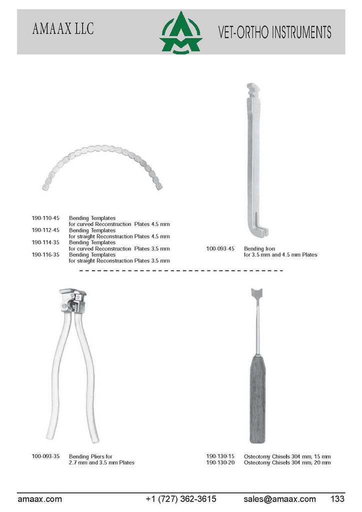 190-110-45 Bending Templates for curved Reconstruction Plates 4.5 mm 190-112-45 Bending Templates for straight Reconstruction Plates 4.5 mm 190-114-35 Bending Templates for curved Reconstruction Plates 3.5 mm 100-093-45 Bending Iron 190-116-35 Bending Templates for 3.5 mm and 4.5 mm Plates for straight Reconstruction Plates35mm . 100-093-35 Bending Pliers for 190-130-15 Osteotomy Chisels 304 mm, 15 mm 2.7 mm and 3.5 mm Plates 190-130-20 Osteotomy Chisels 304 mm, 20 mm