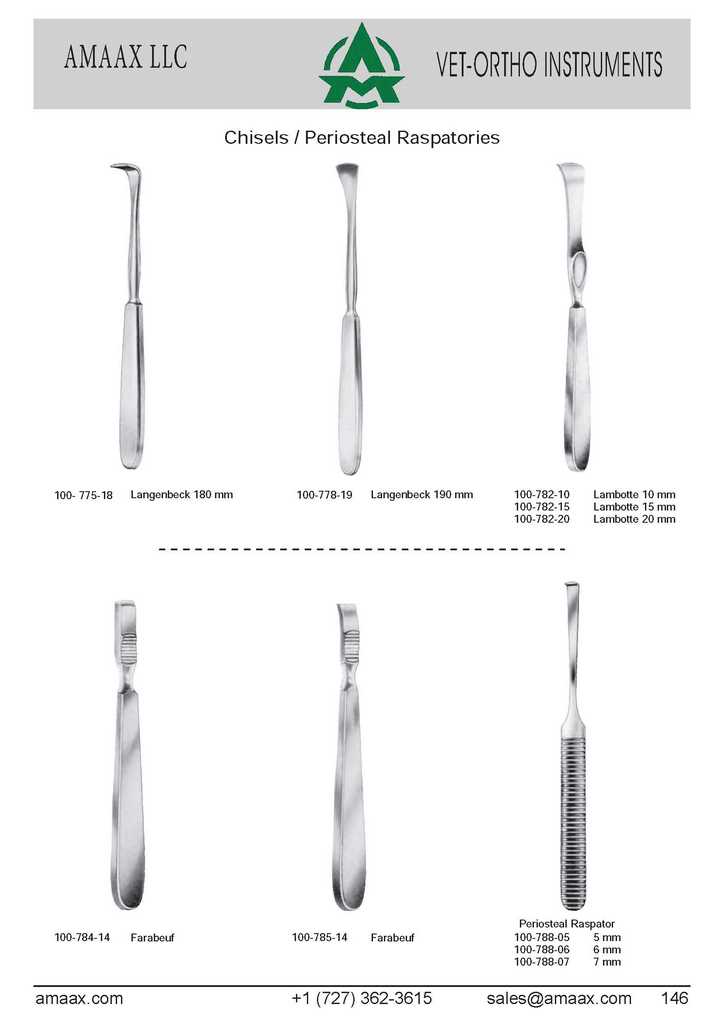 Chisels / Periosteal Raspatories 100-775-18 Langenbeck 180 mm 100-778-19 Langenbeck 190 mm 100-782-10 Lambotte 10 mm 100-782-15 Lambotte 15 mm 100-782-20 Lambotte 20 mm Periosteal Raspator 100-784-14 Farabeuf 100-785-14 Farabeuf 100-788-05 5mm 100-788-06 6mm 100-788-07 7mm