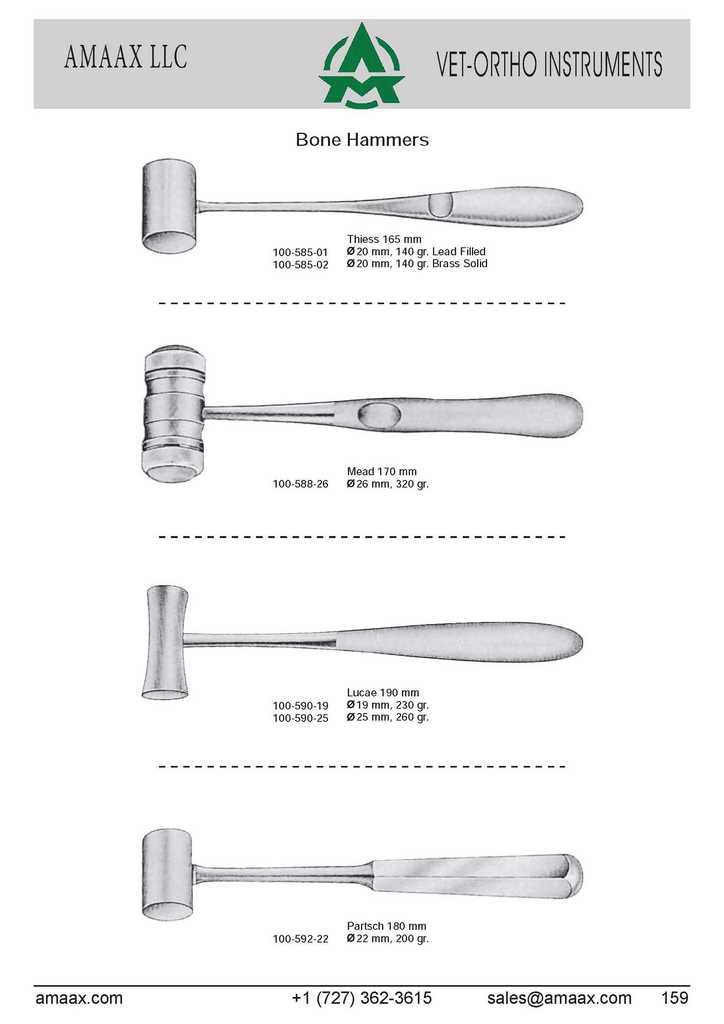 Bone Hammers Thiess 165 mm 100-585-01 20 mm, 140 gr. Lead Filled 100-585-02 20 mm, 140 gr. Brass Solid 19 mm, 230 gr. 100-590-25 25 mm, 260 gr. Partsch 180mm 100-592-22 22 mm, 200 gr.
